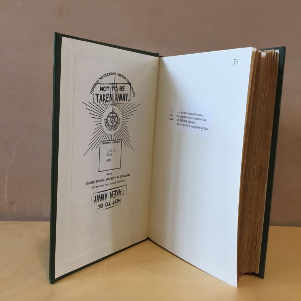 Hardcover. Rebound in green cloth binding which is in very good condition. Formerly belonging to the Theosophical Lending Library, Gloucester Place. Libray stamps to end paper, copyright and title pages. Otherwise unmarked. A tight copy. Very good condition.