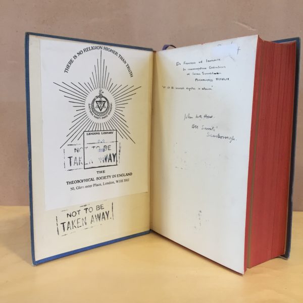 Hardcover. Blue cloth binding. Minor wear to book covers. Spine is ripped at the top edge and has been fixed with a thin strip of tape. Formerly belonging to the Theosophical Lending Library, Gloucester Place. Library stamps to text block, end paper, copyright and title pages. Otherwise no markings. A tight copy. Very good condition.